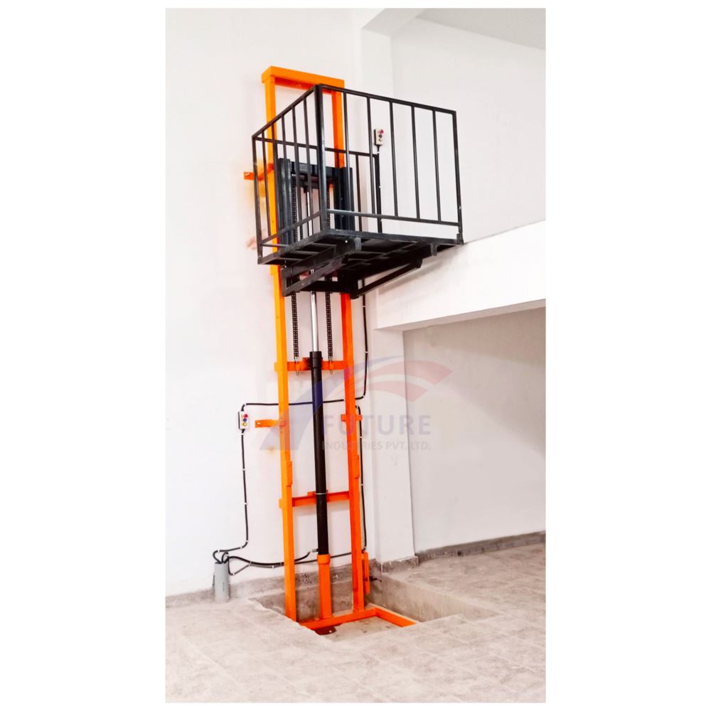 Hydraulic Goods Lift is a fix structure used to shift materials from one floor to another. The Single Mast Goods Lift has one side Hydraulic Cylinder with guide structures of “C” Channels.